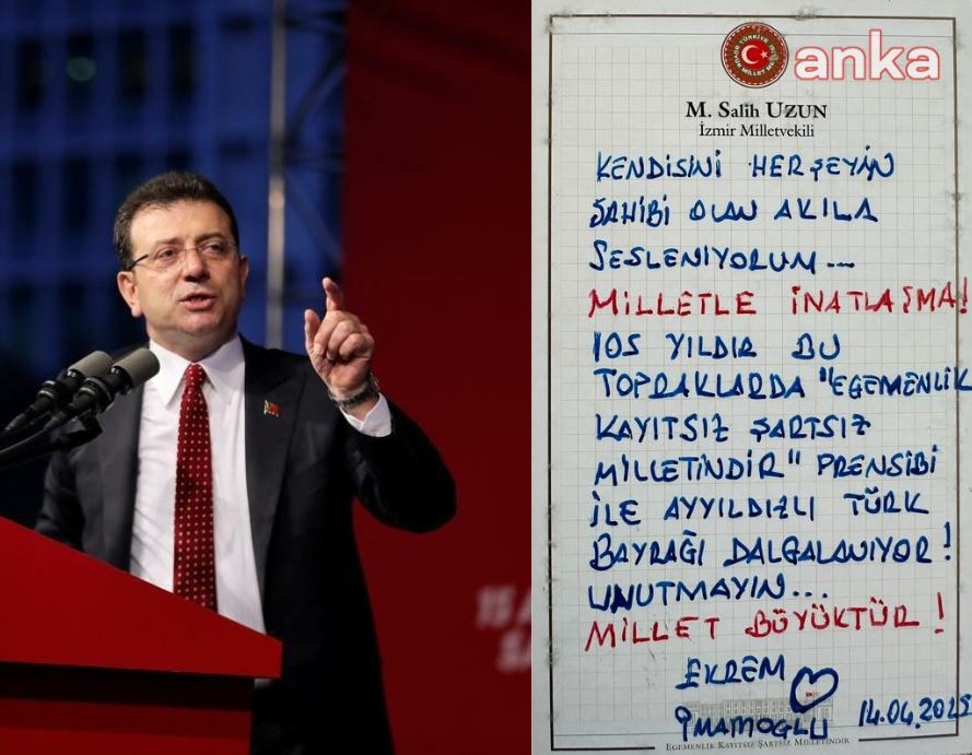 Tutuklu bulunan CHP’nin Cumhurbaşkanı Adayı ve İstanbul Büyükşehir Belediye Başkanı Ekrem İmamoğlu, CHP İzmir Milletvekili Salih Uzun aracılığıyla kamuoyuna mesaj gönderdi. İmamoğlu, paylaşımda iktidara seslenerek, “Milletle inatlaşma” çağrısı yaptı.